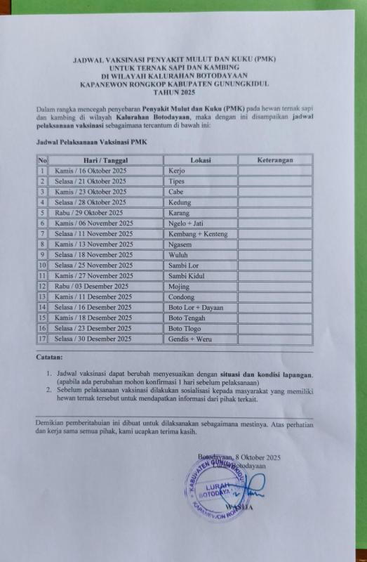 ( SIDA ) Dalam rangka mencegah penyebaran Penyakit Mulut dan Kuku (PMK) Dinas Kesehatan Hewan Kab.Gunungkidul akan mengadakan Vaksin ke 21 Padukuhan se Kalurahan Botodayaan. Kegiatan ini akan di laksanakan selama 3 Bulan di mulai bulan oktober dan selesai di bulan desember 2025. Lurah Botodayaan Bapak Wasija ketika di temui tim SIDA mengatakan bahwa kegiatan ini merupakan program Dinas Kesehatan Hewan untuk mencegah penularan penyakit mulut dan kuku di wilayah Kalurahan Botodayaan. (Cello)