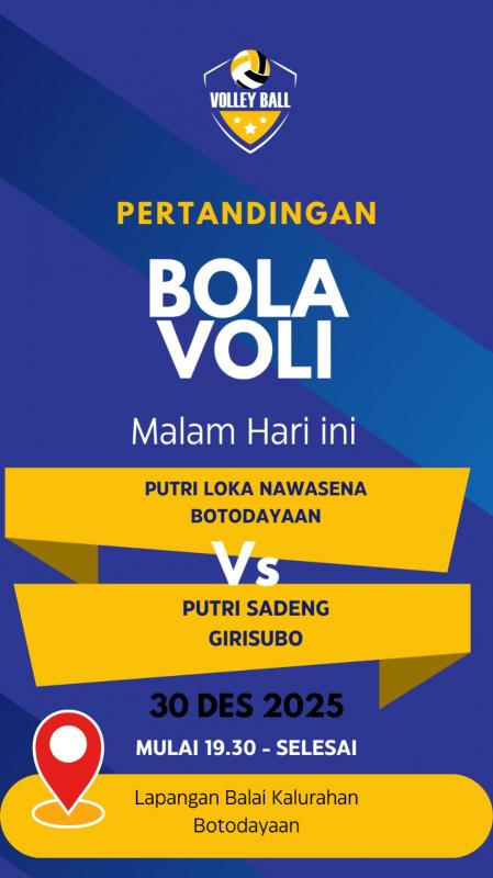 (SIDA) Dalam upaya meningkatkan minat olahraga sekaligus mempererat silaturahmi antar Klub, Karang Taruna Lokanawasena menggelar Latihan bersama Bola Volly yang menghadirkan tim Putri Loka Nawasena Botodayaan Vs Putri Sadeng Girisubo, Selasa, 30 Desember 2025 pukul 19.30 WIB.Kapten tim Lokanawasena Mike Ika ketika ditemui Tim SIDA mengatakan bahwa Latihan bersama ini dilakukan oleh Tim Lokanawasena sebulan 2 kali tujuanya untuk meningkatkan minat olah raga khususnya Bola Volly di Kalurahan Botodayaan. Dalam pertandingan tersebut di menangkan tim Bola Volly Loka Nawasena dengan skor 3-2. (Cello)
