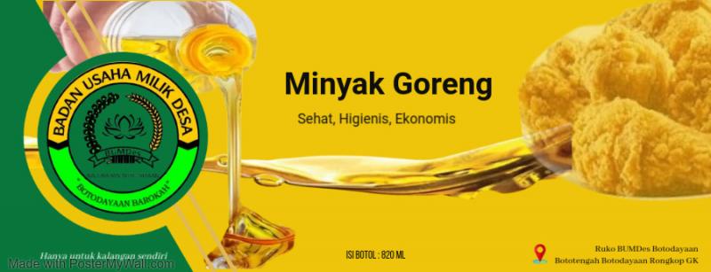 Botodayaan (SID) - BUMDes Botodayaan Barokah resmi menyediakan minyak goreng curah murah dan berkualitas bagi masyarakat. Produk minyak goreng ini dihasilkan dari minyak sawit mentah atau Crude Palm Oil (CPO) yang terjamin sehat, higienis, dan ekonomis. Layanan penjualan dipusatkan di unit usaha BUMDes yang berlokasi di wilayah Bototengah, Kalurahan Botodayaan, Kapanewon Rongkop.