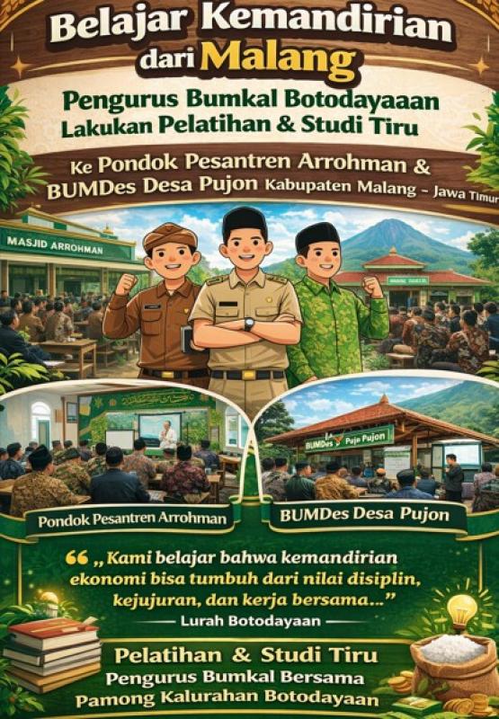 Botodayaan (SID) - Dalam upaya memperkuat kapasitas dan profesionalisme pengelolaan Badan Usaha Milik Kalurahan (Bumkal), pengurus Bumkal bersama pamong Kalurahan Botodayaan melaksanakan pelatihan dan studi tiru ke Pondok Pesantren Arrohman, Malang, serta BUMDes Desa Pujon, Kabupaten Malang, Jawa Timur. Kegiatan ini menjadi sarana pembelajaran langsung dari praktik-praktik sukses pengelolaan usaha berbasis desa dan pesantren.