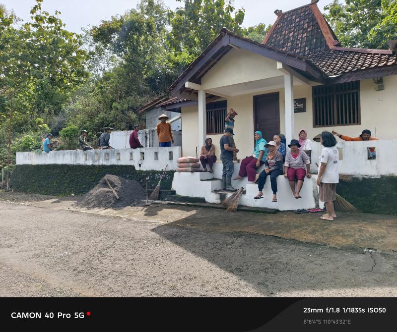 Sejak pagi hari, warga terlihat membersihkan halaman balai dusun, menyapu area sekitar, merapikan saluran air, serta mengumpulkan sampah dan material sisa bangunan. Peralatan sederhana seperti sapu, cangkul, dan alat kebersihan lainnya digunakan secara bersama-sama dalam suasana guyub dan penuh keakraban.