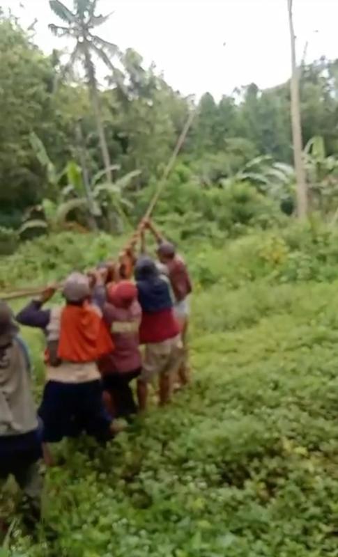 Dengan kerja sama dan kekompakan, warga saling membantu menarik dan mengarahkan batang kayu agar roboh dengan aman. Meski menggunakan peralatan seadanya, proses berjalan lancar berkat koordinasi dan kehati-hatian bersama.