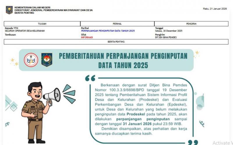 Perpanjangan ini ditujukan bagi desa dan kelurahan yang belum menyelesaikan penginputan data tahun 2025. Sesuai surat Ditjen Bina Pemdes Nomor 100.3.3.9/6698/BPD tanggal 19 Desember 2025, batas akhir penginputan data diperpanjang hingga Tanggal 31 Januari 2026 pada Pukul 23.59 WIB