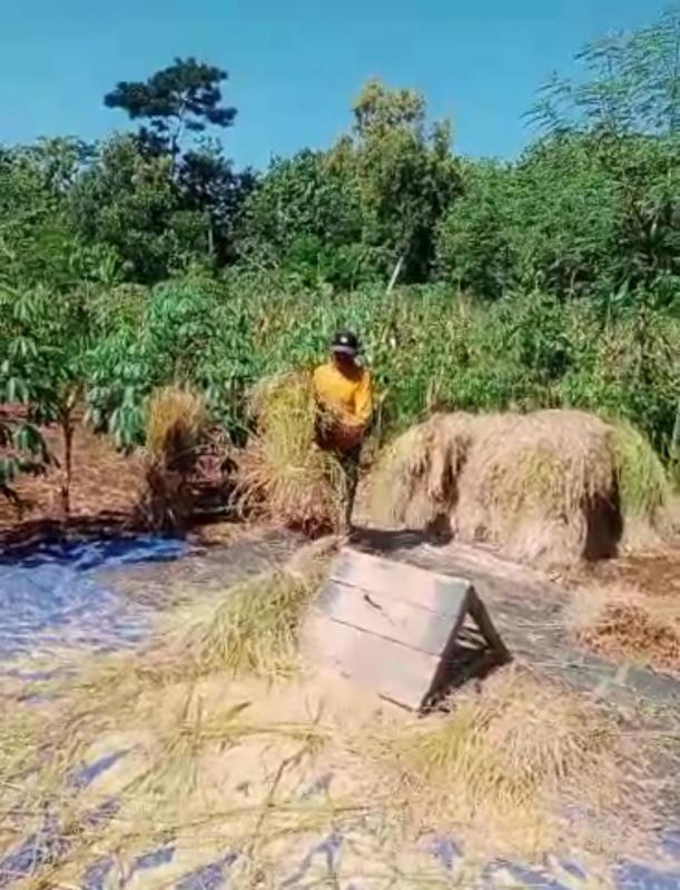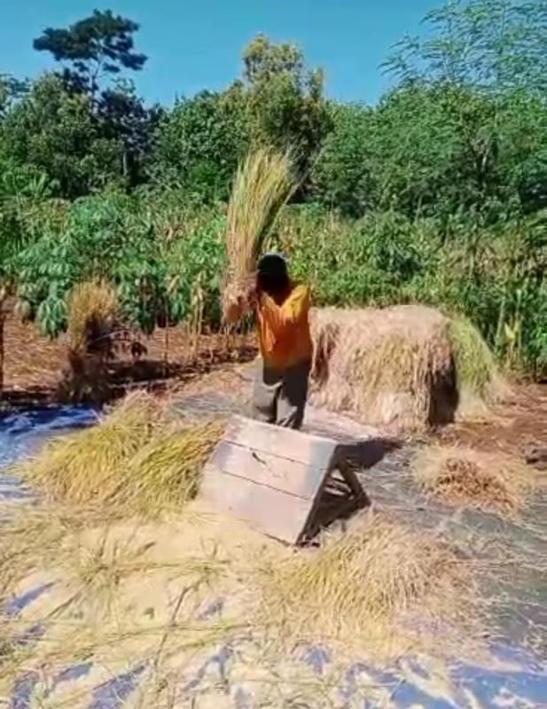 Di atas terpal sederhana, batang-batang padi dipukulkan ke papan hingga gabah rontok dan berjatuhan. Di sampingnya, jerami menggunung, menjadi saksi kerja keras tangan-tangan petani desa yang masih setia pada cara tradisional. Meski terlihat sederhana, cara ini masih dipilih Pak Sukiran karena dinilai lebih irit dan sesuai dengan kondisi lahan. Baginya, panen bukan soal cepat atau lambat, tapi soal rasa cukup dan syukur.