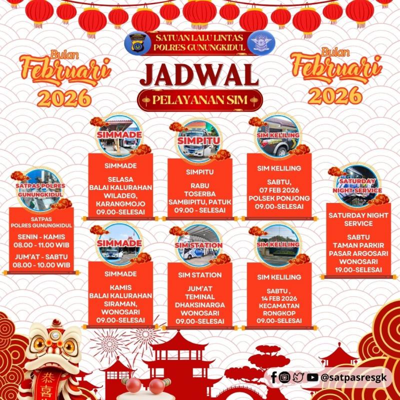 Botodayaa (SID) - Satuan Lalu Lintas (Satlantas) Polres Gunungkidul merilis jadwal pelayanan Surat Izin Mengemudi (SIM) untuk bulan Februari 2026. Pelayanan dilakukan melalui Satpas Polres, SIM Made, SIM Keliling, SIM Pitu, SIM Station, serta layanan Saturday Night Service.