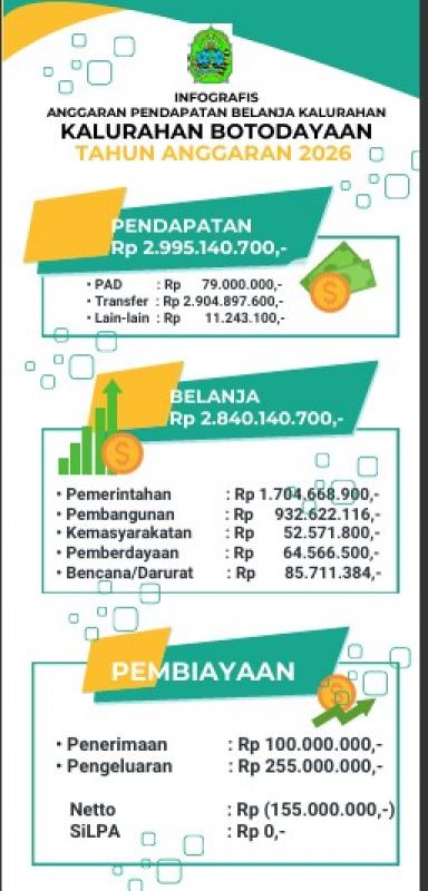 Dalam APBKal Tahun Anggaran 2026, total pendapatan Kalurahan Botodayaan ditetapkan sebesar Rp2.995.140.700,00, dengan belanja sebesar Rp2.840.140.700,00, sehingga terdapat surplus anggaran sebesar Rp155.000.000,00 . Pendapatan tersebut bersumber dari Pendapatan Asli Desa, pendapatan transfer, serta pendapatan lain-lain yang sah.