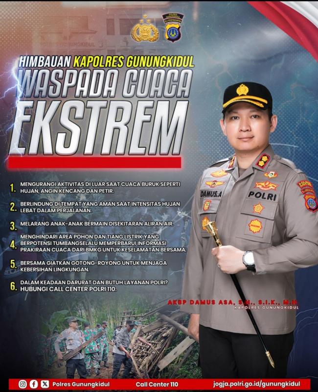 Kapolres Kabupaten Gunungkidul menghimbau kepada seluruh masyarakat Kabupaten Gunungkidul untuk waspada cuaca ekstrem yang saat ini masih melanda di beberapa tempat atau wilayah di kabupaten Gunungkidul dengan cuaca, hujan, amgin dan petir.