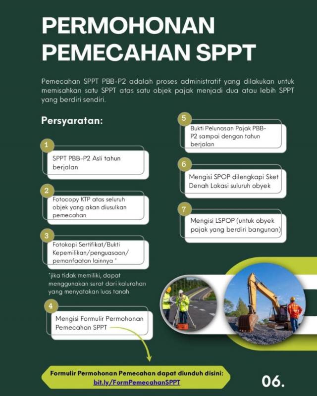 Formulir permohonan pemecahan SPPT dapat diunduh melalui tautan yang telah disediakan. Diharapkan dengan adanya informasi ini, masyarakat dapat lebih memahami prosedur administrasi perpajakan sehingga proses pelayanan dapat berjalan lebih mudah dan tertib.