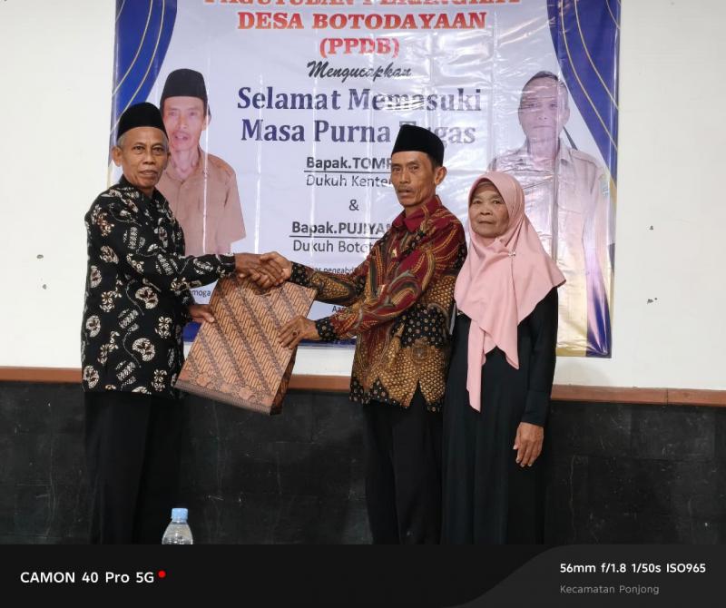 Dalam kesempatan tersebut, PPDB Botodayaan memberikan kenang-kenangan sebagai bentuk apresiasi atas pengabdian yang telah diberikan. Diharapkan, meskipun telah memasuki masa purna tugas, semangat pengabdian dan kebersamaan yang selama ini terjalin tetap menjadi teladan bagi perangkat desa maupun masyarakat dalam menjaga kerukunan dan membangun Kalurahan Botodayaan ke depan.