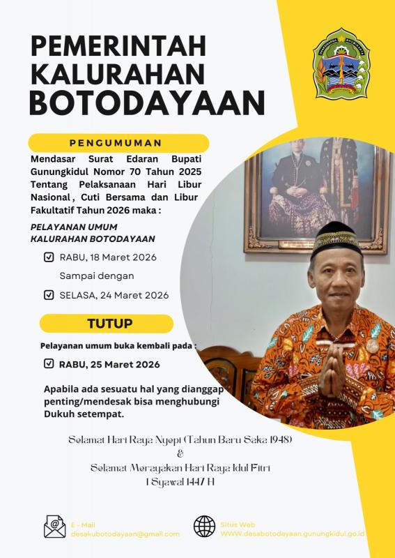 Botodayaan (SID) - Pemerintah Kalurahan Botodayaan mengumumkan bahwa pelayanan umum di kantor kalurahan akan ditutup sementara mulai Rabu, 18 Maret 2026 hingga Selasa, 24 Maret 2026. Penutupan ini mengacu pada Surat Edaran Bupati Gunungkidul Nomor 70 Tahun 2025 tentang Pelaksanaan Hari Libur Nasional, Cuti Bersama, dan Libur Fakultatif Tahun 2026. Kebijakan tersebut diambil dalam rangka peringatan Hari Raya Nyepi Tahun Baru Saka 1948 serta menyambut Hari Raya Idul Fitri 1 Syawal 1447 Hijriah.