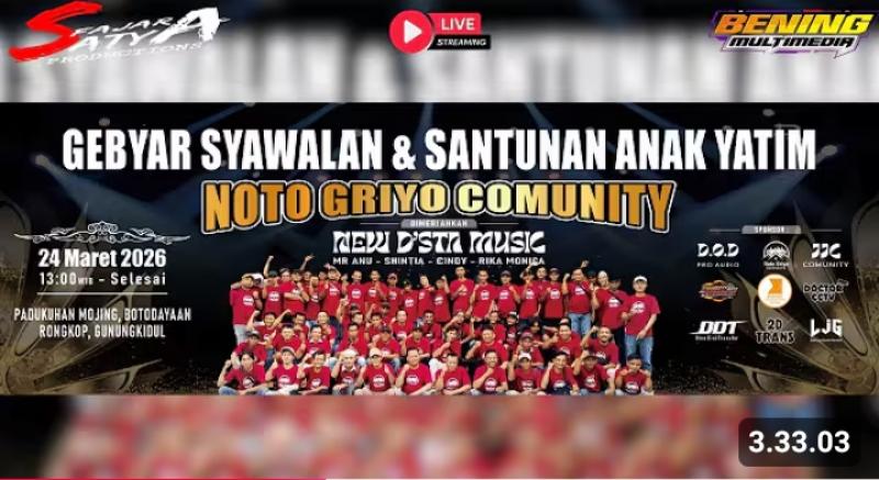 (SIDA) Dalam rangka hari raya idul fitri 1447 H / 2026 M komonitas perantau di jakarta yang tergabung dalam wadah Noto griyo pada hari selasa, 24 Maret 2026 mengadakan kegiatan syawalan dengan menghadirkan hiburan OM New d'sta Musik. Kegiatan ini merupakan rangkaian acara puncak syawalan yang hari sebelumya sudah diadakan santunan anak yatim.